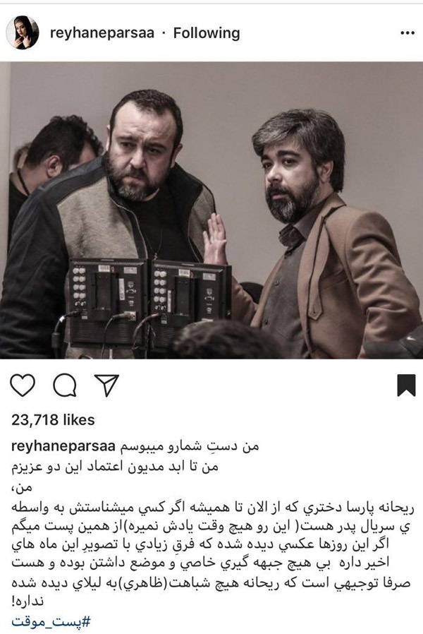 همچنین پارسا در ادامه افزود: من تا ابد مدیون اعتماد این دو عزیزم... من، ریحانه پارسا دختری که از الان تا همیشه اگر کسی میشناستش به واسطهی سریال پدر هست (این رو هیچ وقت یادش نمیره) از همین پست میگم، اگر این روزها عکسی دیده شده که فرق زیادی با تصویر این ماههای اخیر داره، بیهیچ جبههگیری خاصی و موضع داشتن بوده و هست...