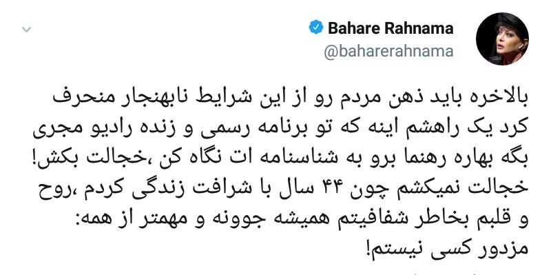 بهاره رهنما به اظهارات مجری رادیو واکنش نشان داد و در توئیتر خود اینگونه نوشت. منبع: سینما سینما 10