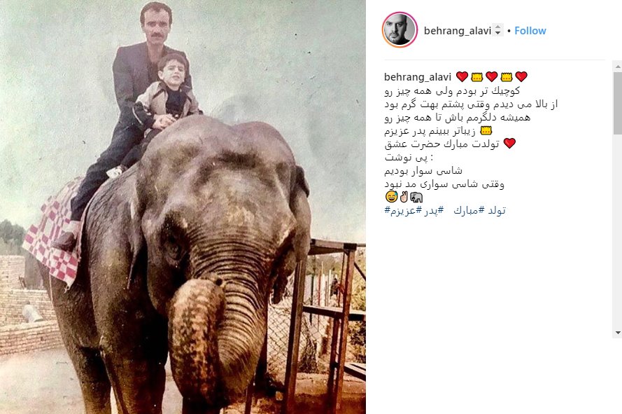 بهرنگ علوی، بازیگر سینما و تلویزیون، تصویری قدیمی از کودکی خود را در حالیکه سوار بر فیل شده است، در اینستاگرام منتشر کرد و نوشت: «کوچیک تر بودم ولی همه چیز رو از بالا میدیدم وقتی پشتم بهت گرم بود، همیشه دلگرمم باش تا همه چیز رو، زیباتر ببینم پدر عزیزم. تولدت مبارک حضرت عشق. شاسی سوار بودیم، وقتی شاسی سواری مد نبود.»