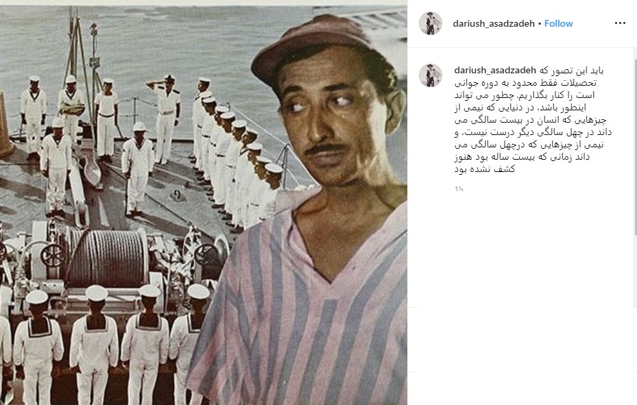 داریوش اسدزاده، تصویری بسیار قدیمی از بازیاش در یک فیلم را در اینستاگرام منتشر کرد و در توضیح آن نوشت: «باید این تصور که تحصیلات فقط محدود به دوره جوانی است را کنار بگذاریم. چطور میتواند اینطور باشد، در دنیایی که نیمی از چیزهایی که انسان در بیست سالگی میداند در چهل سالگی دیگر درست نیست و نیمی از چیزهایی که در چهل سالگی میداند زمانی که بیست ساله بود هنوز کشف نشده بود.»