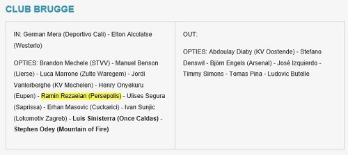 این سایت در گزارشی، ورودی و خروجی تیمهای بلژیکی برای فصل 18-2017 را مورد بررسی قرار داده است که نام رامین رضاییان که اخیراً با توافق از باشگاه پرسپولیس جدا شد در لیست ورودی تیم کلوب بروژ بلژیک قرار دارد.