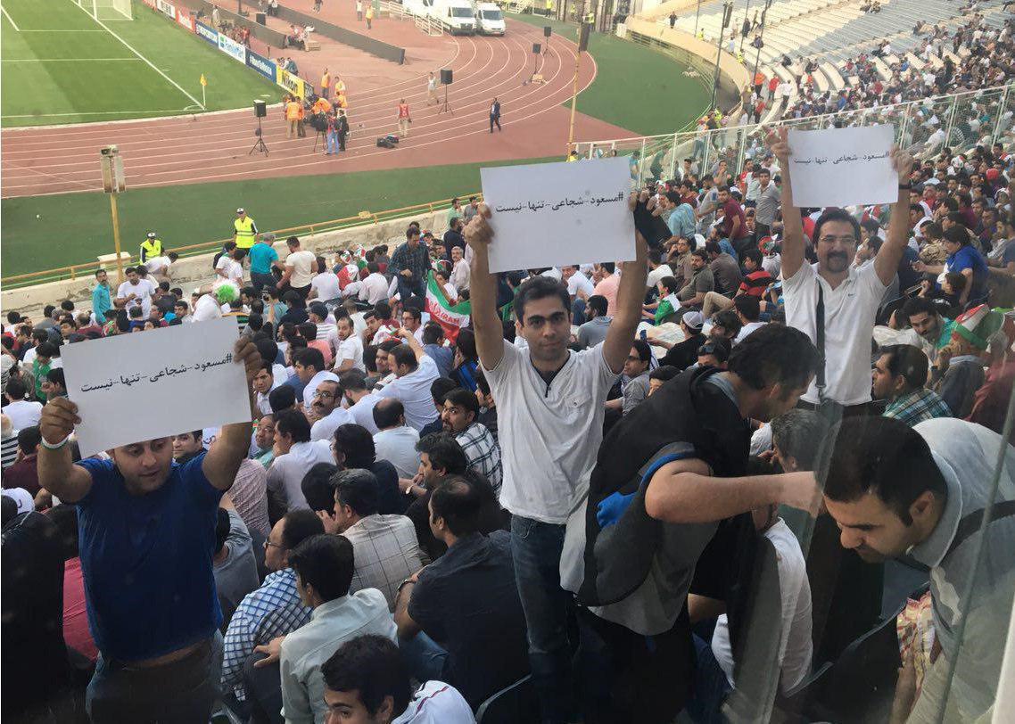 تعدادی از تماشاگران تیم ملی با در دست داشتن نوشتههایی از مسعود شجاعی حمایت کردند.