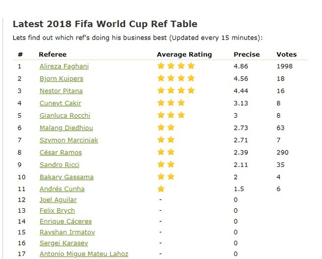 سایت Ratetheref در نظرسنجی داروان جام جهانی را تا به این لحظه ارزیابی کرده که در این ارزیابی علیرضا فغانی در صدر قرار دارد.