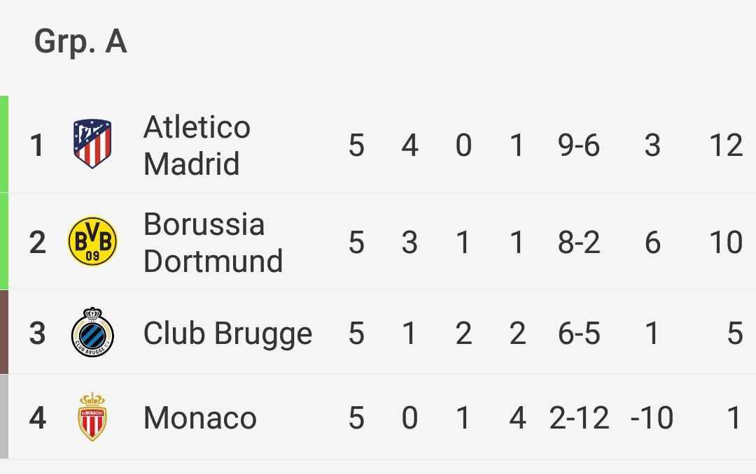 اما جدال شگفت انگیز این گروه برای صدرنشین و تیم دوم تا دقایق پایانی ادامه خواهد داشت. اتلتیکو مادرید و بروسیا دورتموند به عنوان دو تیم قدرتمند اسپانیا و آلمان، بازی های رو در رو خود را انجام داده اند و حالا برای کسب صدرنشینی باید مقابل رقبای حذف شده مبارزه کنند. اتلتیکو مادرید که بازی برگشت مقابل زنبور ها را در خانه اش با دو گل پیروز شده، با دوازده امتیاز صدرنشین است. آن ها چهار بازی خود را برده اند و تنها شکست‌شان در مرحله گروهی مقابل بروسیا دورتموند بوده است. دورتموندی ها در بازی رفت با نتیجه 0-4 از خجالت دیگو سیمئونه درآمدند. تساوی بدون گل مقابل بروژ در سیگنال ایدونا پارک در کنار شکست مقابل اتلتیکو تنها بازی های غیر سه امتیازی لوسیان فاوره بودند. سرمربی دورتموند برای صعود به عنوان صدرنشین کار سختی ندارد، او باید مقابل موناکو در ورزشگاه لویی دوم مونت کارلو به پیروزی برسد و امیدوار باشد تا یاران آنتوان گریژمان در بلژیک امتیاز از دست بدهند. اگر اتلتیکو در مقابل بروژ تنها مساوی این فصلش در لیگ قهرمانان را به دست بیاورد، دورتموند با پیروزی مقابل موناکو و به لطف تفاضل گل بهتر به عنوان تیم اول صعود خواهد کرد.