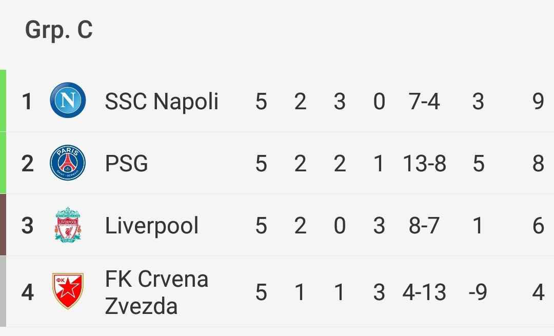 از لحظه قرعه‌کشی این گروه، هیجان یکی از اصلی ترین همراهان آن بوده است. تقابل سه تیم قدرتمند ناپولی، پاریسن ژرمن و لیورپول با شگفتی های ستاره سرخ بلگراد تکمیل شد تا در پایان بازی پنجم این مرحله هر چهار تیم گروه شانس صعود داشته باشند. ناپولی به عنوان تنها تیم بدون شکست گروه سوم، امشب مهمان لیورپول خواهد بود. شاگردان کارلو آنجلوتی با دو پیروزی و سه ستاوی با 9 امتیاز صدرنشین هستند. پاریسن ژرمن با دو پیروزی و دو تساوی در کنار تنها شکستی که در خانه لیورپول به دست آمده، در جایگاه دوم است و شاگردان کلوپ با سه شکست و تنها دو پیروزی با شش امتیاز تقریبا آماده سفر به لیگ اروپا شده اند. در قعر این گروه، ستاره سرخ بلگراد با یک پیروزی، یک تساوی و سه شکست حضور دارد که امشب میزبان قهرمان فرانسه خواهد بود.