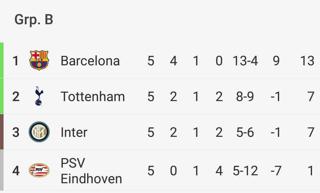 قهرمان اسپانیا در گروه دوم لیگ قهرمانان اروپا بدون شکست می تازد. آن ها با چهار پیروزی و یک تساوی مقابل اینتر، با سیزده امتیاز صدرنشین گروه خود هستند. فاصله امتیاز کاتالان ها با تیم دوم، شش امتیاز و فاضله تفاضل آنان هشت گل است. یاران لیونل مسی که پی‌اس‌وی را دبل کرده اند، امشب برای تکرار این اتفاق میزبان تاتنهام خواهند بود. شرایط اسپرز به همان میزان که رقیب امشبش آرامش دارد، مشوش است. بعید به نظر می رسد تاتنهام در دیدار امشبش با کسب امتیاز از زمین بازی بیرون برود. آن ها با دو پیروزی، یک مساوی و دو شکست با هفت امتیاز در جایگاه دوم جدول قرار دارند. جایگاهی که موقتی به نظر می رسد.