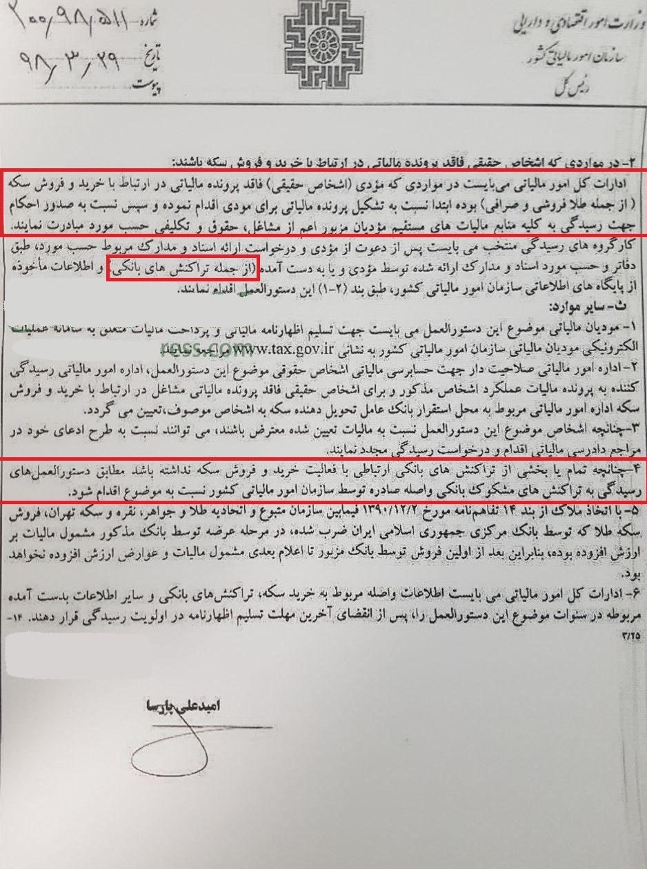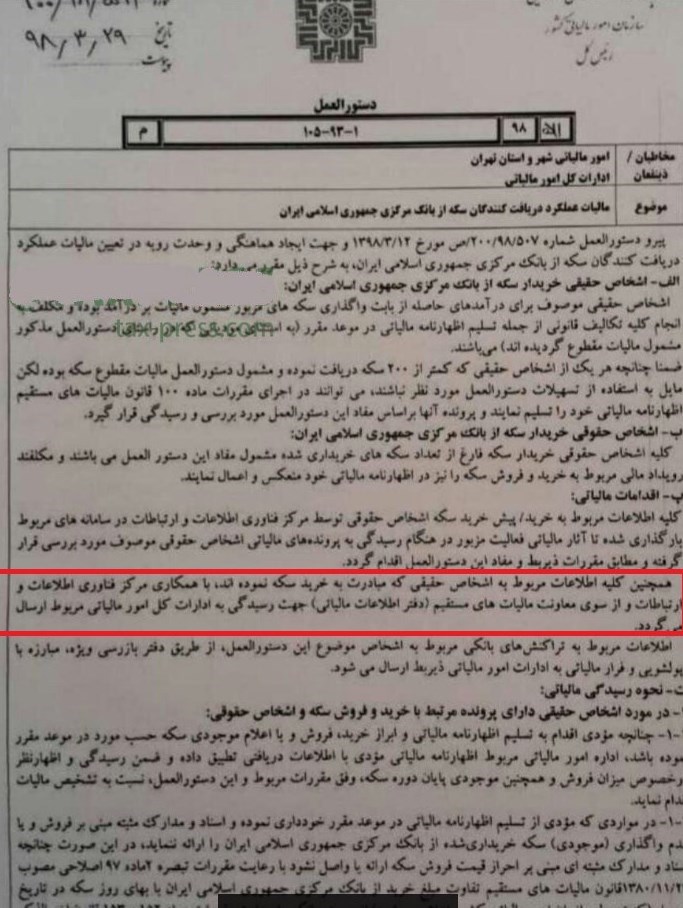 در بخشنامه رئیس کل سازمان مالیاتی آمده است،‌ کلیه اطلاعات مربوط به اشخاص حقیقی که مبادرت به خرید سکه نموده‌اند با همکاری مرکز فناوری اطلاعات و از سوی معانت مالیاتهای مستقیم، جهت رسیدگی به ادارات کل امور مالیاتی ارسال می‌شود. همچنین اطلاعات تراکنشهای بانکی، افراد مربوط به این دستور العمل از طریق دفتر مبارزه با پولشویی و فرار مالیاتی، همچنین بازرسی ویژه به ادارات مالیاتی ذیربط ارسال می‌شود.