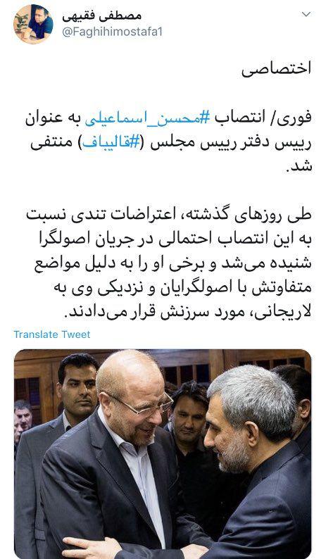 یک فعال رسانهای گفت: انتصاب محسن اسماعیلی به عنوان رییس دفتر رییس مجلس منتفی شد.