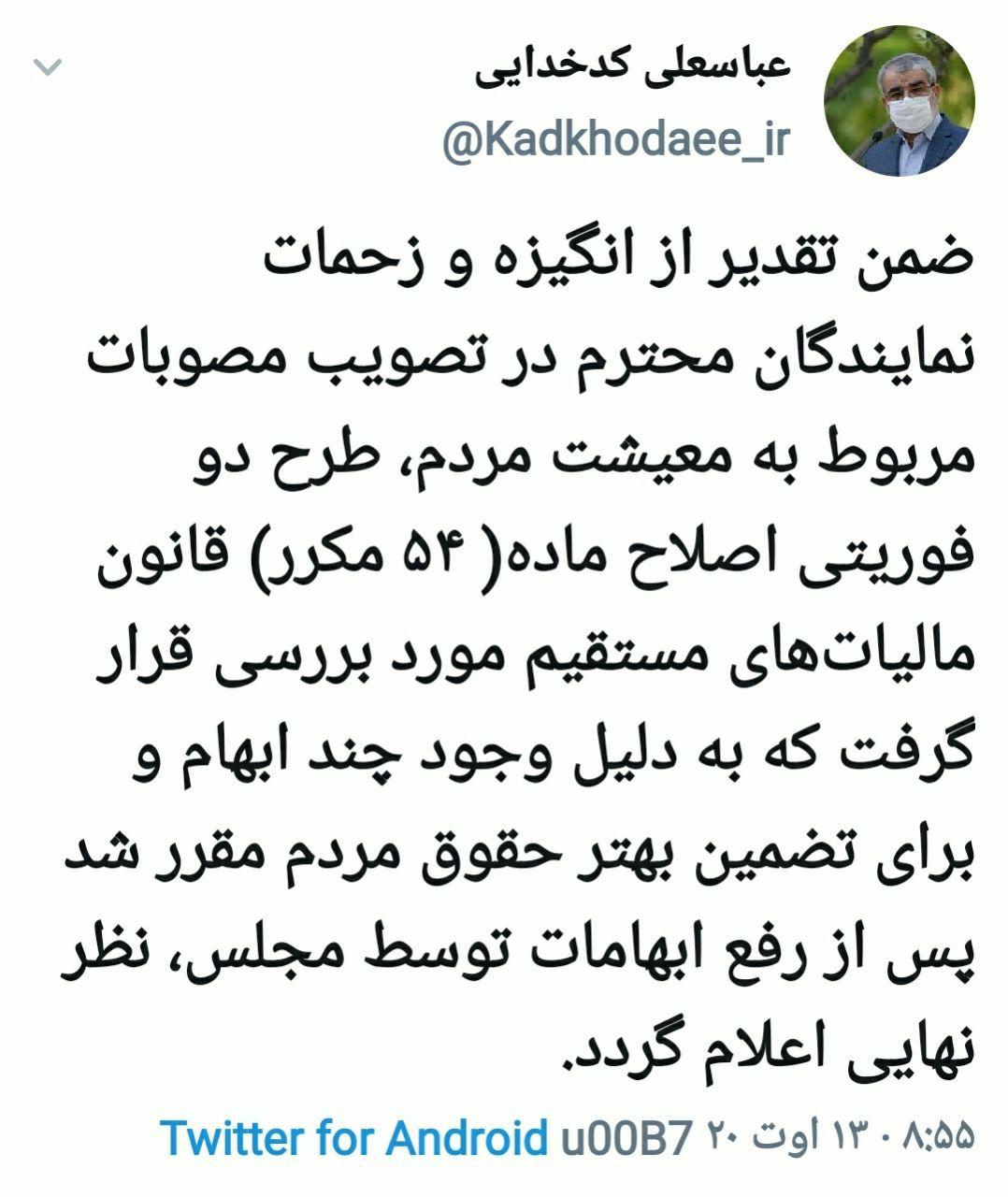 عباسعلی کدخدایی در صفحه توییتر خود نوشت: طرح دو فوریتی مالیات بر خانههای خالی مورد بررسی قرار گرفت و به دلیل وجود چند ابهام و برای تضمین بهتر حقوق مردم مقرر شد پس از رفع ابهامات توسط مجلس، نظر نهایی اعلام شود.