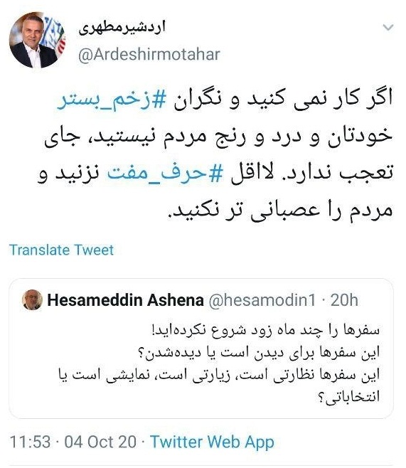 یک نماینده مجلس در توئیتی خطاب به مشاور فرهنگی رئیس جمهور نوشت: اگر کار نمی کنید و نگران زخم بستر خودتان و درد و رنج مردم نیستید، جای تعجب ندارد.