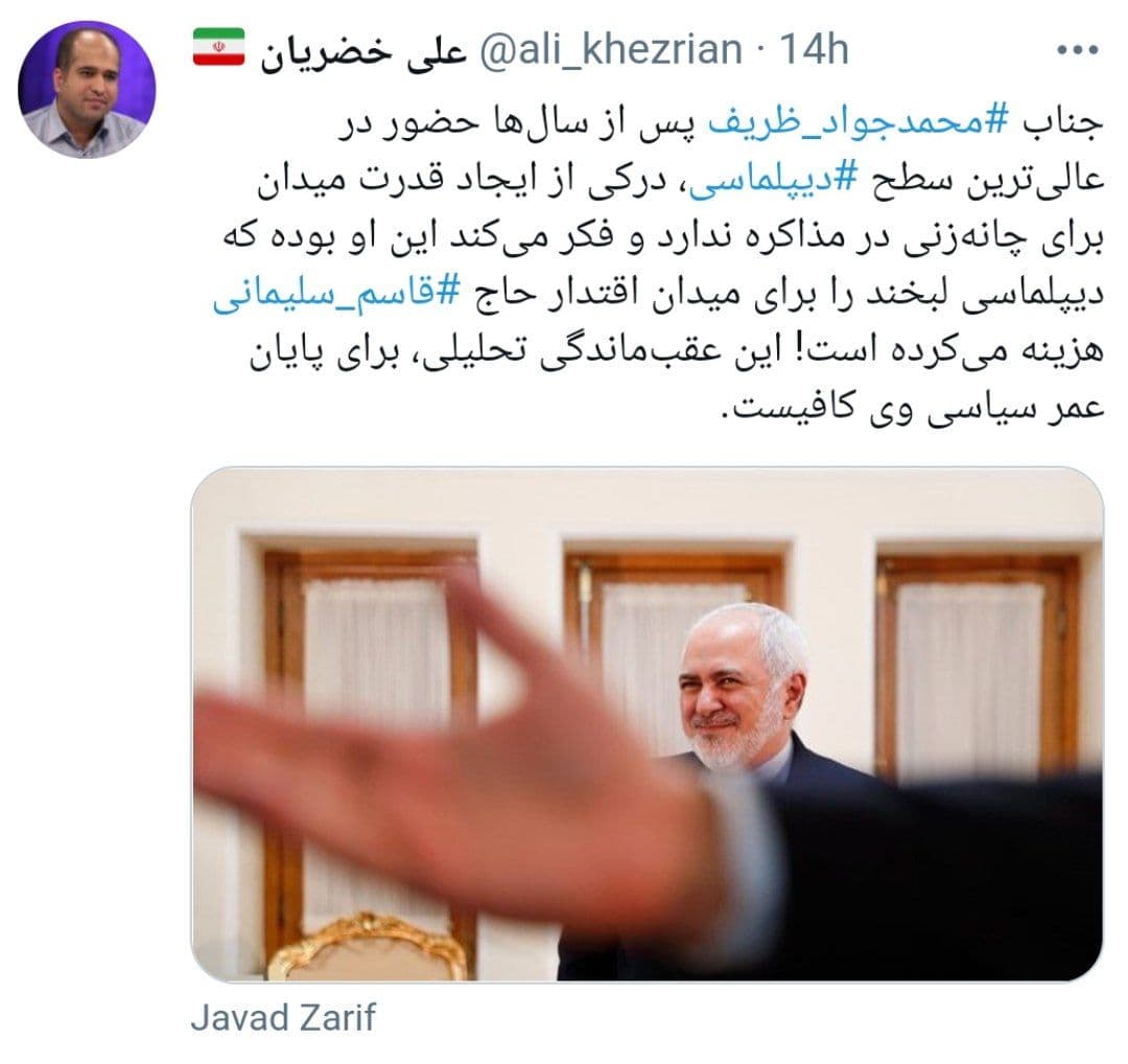 هیچ وقت نباید توقع داشت همچون تویی بیاد خوبی ظریف و بگه که اگه میگفت جای تعجب داشت متن و توئیتت سرشار از بی ادبی و خراب کردن آقای ظریف در چشم مردم است من اصلا کاری به آقای ظریف ندارم صحبت م اینه آدم اگه میخواد معروف بشه نباید یکی دیگه رو خراب کنه...تا اونجایی که ما میدونیم رابطه ظریف با سردار سلیمانی خیلی خوب بوده...