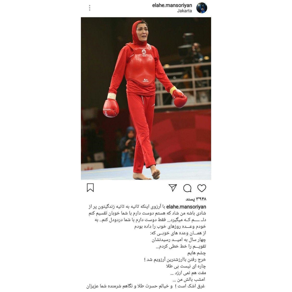 الهه منصوریان بانوی وشوکار ایران، پس از اینکه توانست مدال نقره بازی های آسیایی جاکارتا را مال خود کند، دلنوشته غم انگیزی را در صفحه اینستاگرامش منتشر کرد. منبع: خبرآنلاین 1515